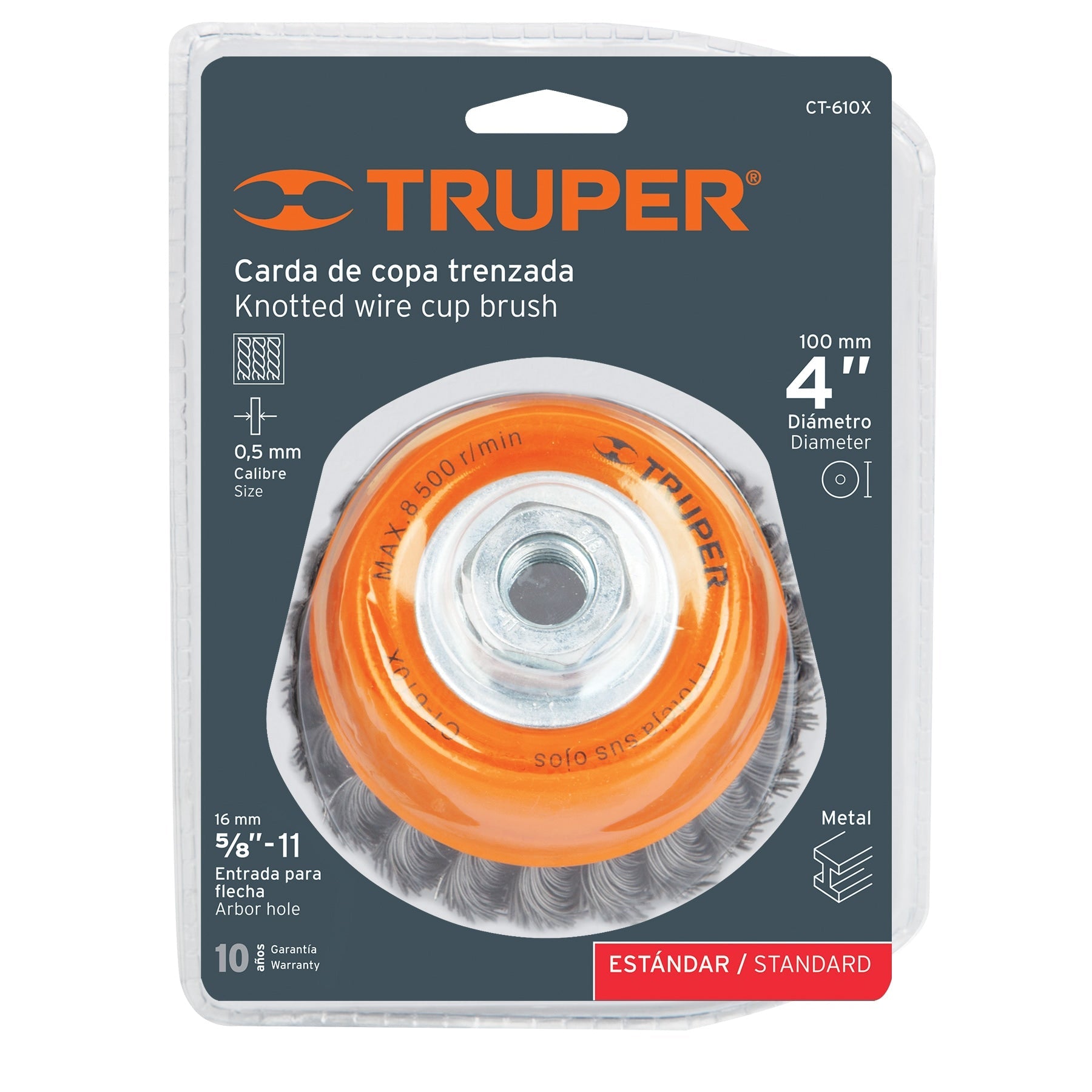 Carda copa 4' alambre trenzado grueso, eje 5/8'-11, Truper