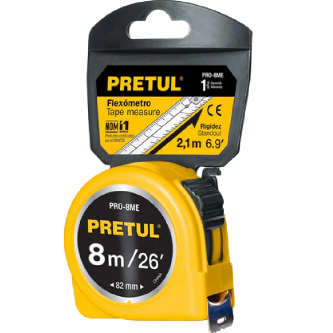 1400-Flexómetro Amarillo 8 M Cinta 25 Mm En Tarjeta Pretul 21603 Truper