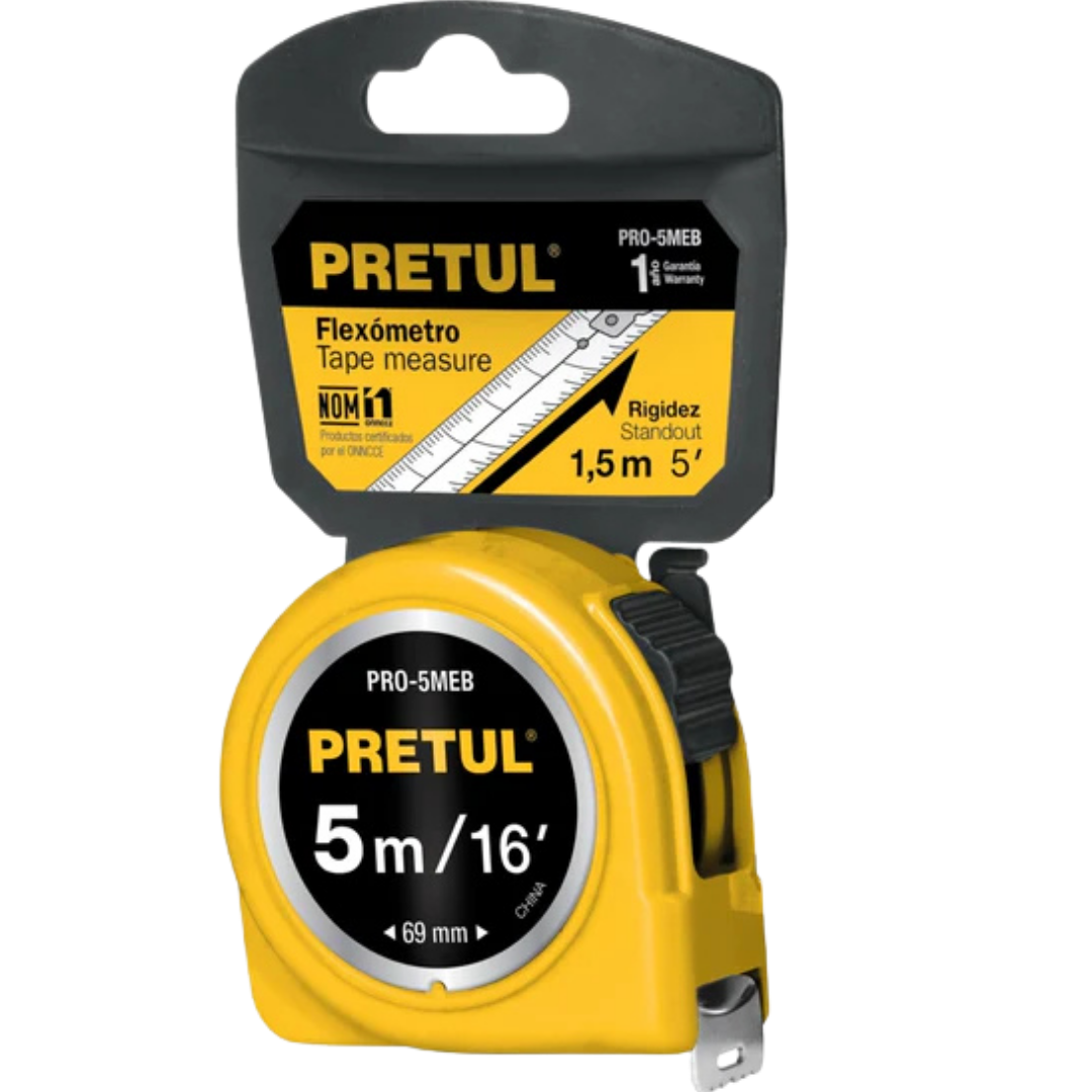 Flexómetro Amarillo 5 m, Cinta 19 mm, En Tarjeta, Pretul Catalogo