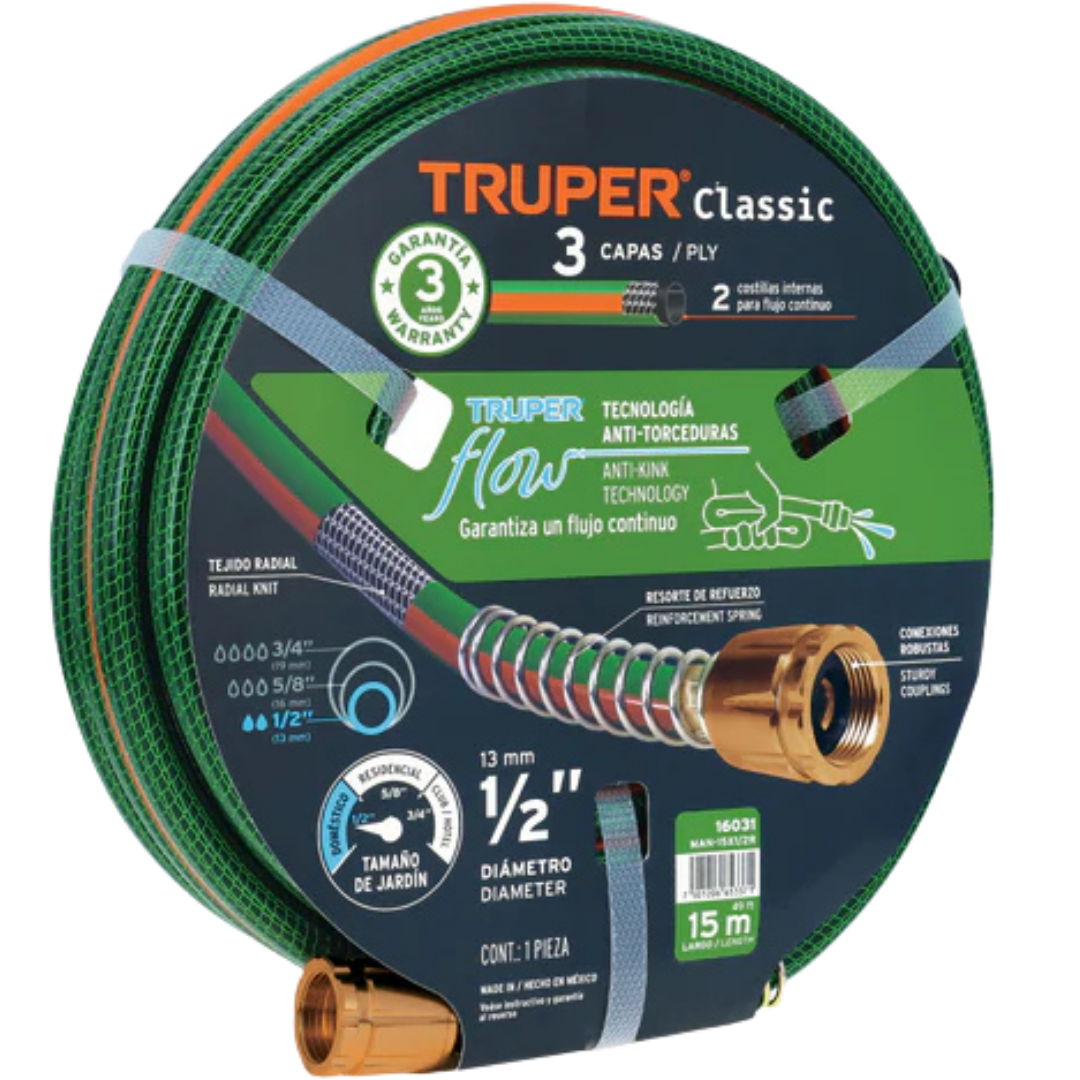 Manguera 1/2' Reforzada 3 Capas 15 M Conexiones De Metal Truper Catalogo